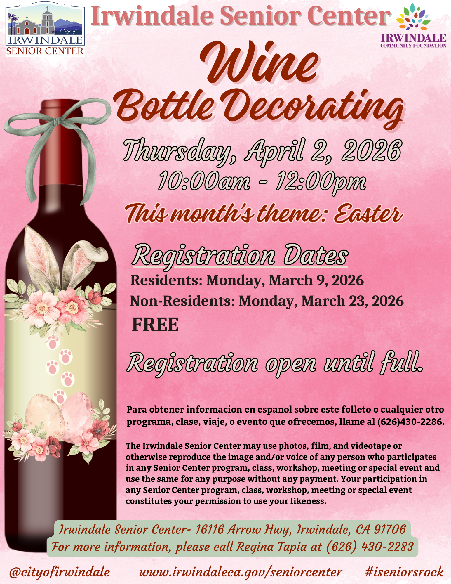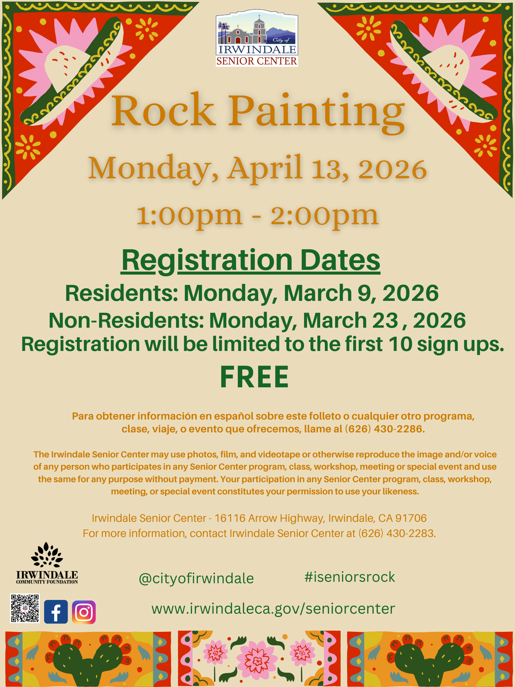 Register in person at the Irwindale Senior Center Monday, Tuesday, Thursday 8:30am - 4:30pm Wednesday from 8:30am - 6:30pm and Friday from 8:30am - 2:00pm.